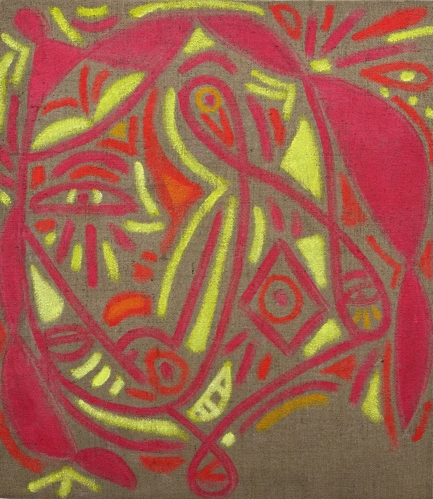 Viacha Clásica, 2024, acrylic, phosphorescent paint, on repurposed cement bag, 36x32"/ 91x81 cm (irregular)