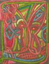 Viacha Cruz, 2024, acrylic, phosphorescent paint, on repurposed cement bag, 42x34"/ 107x86cm