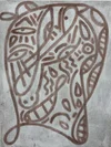 Viacha Clásica, 2024, acrylic, phosphorescent paint, on repurposed cement bag, 36x32"/ 91x81 cm (irregular)